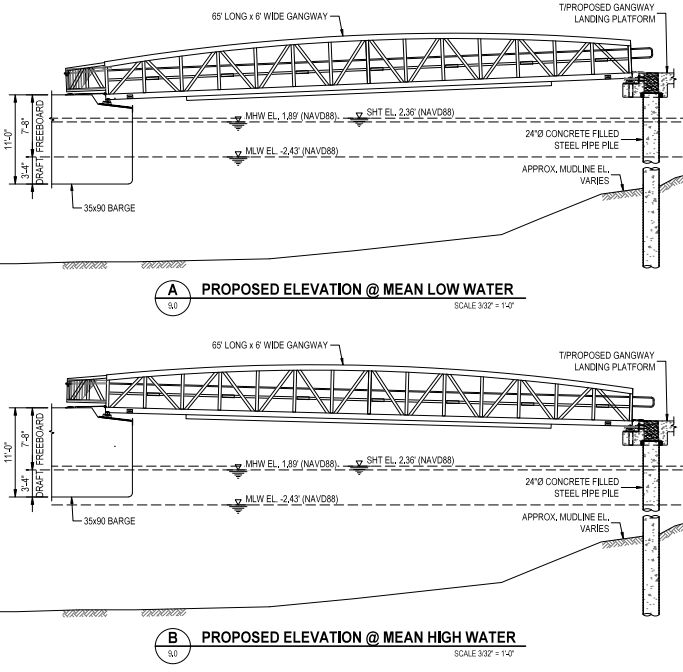 A 65-foot-long footbridge, known as a gangway, would then connect the platform to a 90-foot-long by 35-foot wide barge (Sheet 8 of the plans)